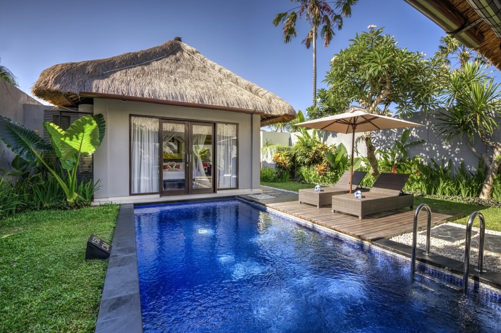 A relaxing Enjoy Bali Package 4D3N in a One Bedroom Private Pool Villa, including floating breakfast, massage, scooter rental, cooking class, and local experiences.